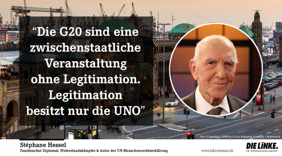 „Stéphane Hessel, der bekannte französische Diplomat, Widerstandskämpfer und Co-Autor der UN-Menschenrechtserklärung, sagte einst „Die G20 sind eine Veranstaltung ohne Legitimation. Legitimation besitzt nur die UNO.“ Daher wird sich Hamburg empören. Natürlich sollen Staatschefs miteinander reden. Aber die G20 verhandeln über das Schicksal der Welt. Diese Debatten gehören daher vor die Vereinten Nationen in New York. Dann hätte es Herr Trump auch von seinem Golfplatz nicht so weit.“