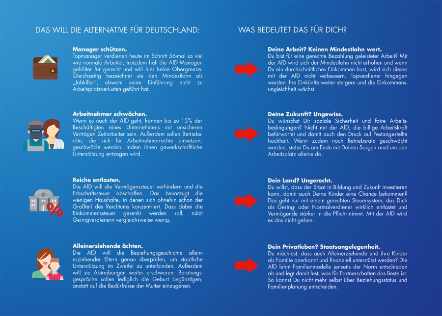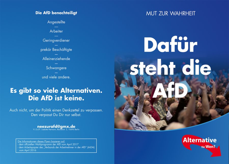 Eine Gruppe junger politisch-engagierter Menschen hat ein interessantes Flugblatt gestaltet, das deutlich macht, dass die AfD für Rentner, Angestellte, Arbeiter oder Alleinerziehende keine Alternative ist.