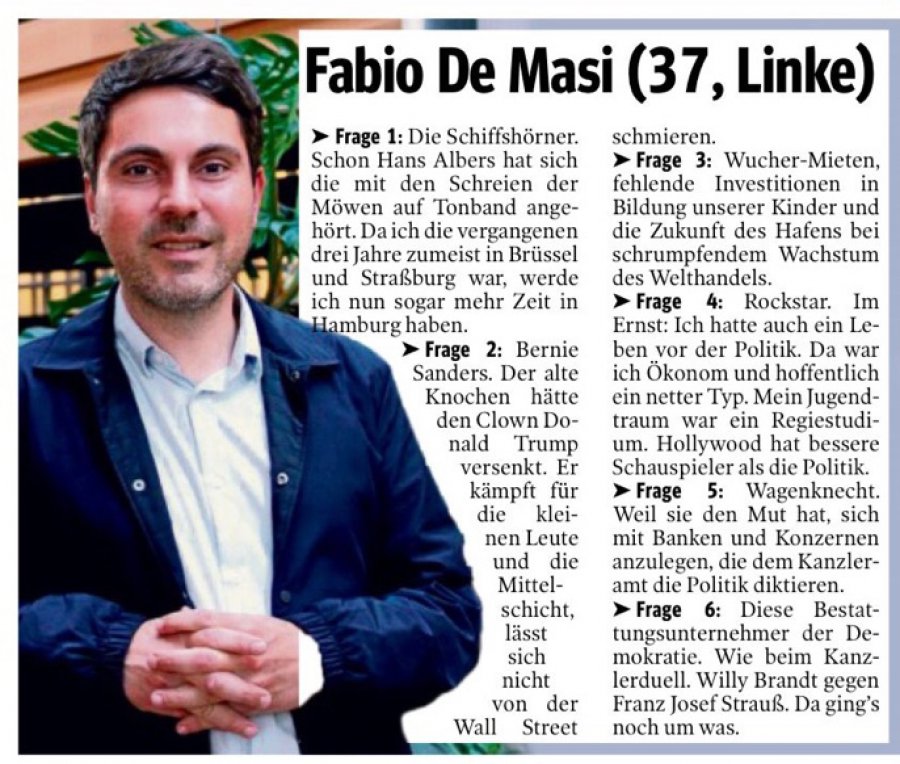 Die MOPO interviewte die Spitzenkandidaten zur Bundestagswahl in Hamburg. Fabio De Masi erklärt, warum Wagenknecht die bessere Kanzlerin wäre und was sein Jugendtraum war.