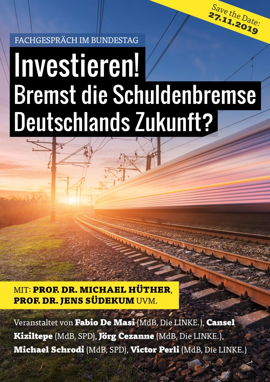 Das "Fachgespräch" am 27. November im Bundestag steht unter dem Motto "Investieren! Bremst die Schuldenbremse Deutschlands Zukunft?". Veranstalter sind die SPD-Finanzpolitikerin Cansel Kiziltepe, ihr Fraktionskollege Michael Schrodi sowie die Parlamentarier Fabio de Masi, Victor Perli und Jörg Cezanne von der Linkspartei.