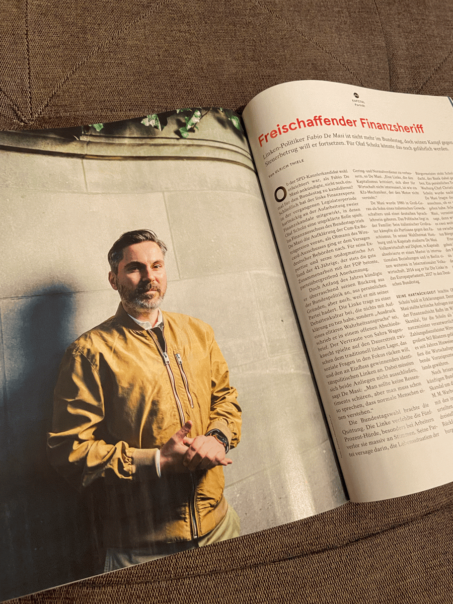 Ob der SPD-Kanzlerkandidat wohl erleichtert war, als Fabio De Masi ankündigte, nicht noch einmal für den Bundestag zu kandidieren? Schließlich hat der linke Finanzexperte in der vergangenen Legislaturperiode hartnäckig an der Aufarbeitung zweier Finanzskandale mitgewirkt, in denen Olaf Scholz eine ungeklärte Rolle spielt. Im Finanzausschuss des Bundestags trieb De Masi die Aufklärung der Cum-Ex-Betrügereien voran, als Obmann des Wirecard-Ausschusses ging er dem Versagen deutscher Behörden nach.
