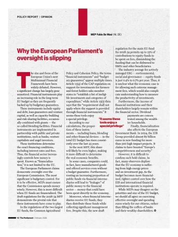 Das Europäische Parlament beansprucht die demokratische Kontrolle über die Europäische Kommission. Die wichtigste dieser Kontrollen ist in der Tat die Haushaltskontrolle. Damit diese wirksam ist, müssen die Abgeordneten sicherstellen, dass die Kommission die Gelder sinnvoll ausgibt. Dies ist jedoch schwieriger, wenn EU-Mittel finanzialisiert werden. Der Entwurf der Verordnung für den MFR 2028-2034 zeigt, welche zentrale Rolle diese Instrumente mittlerweile spielen.