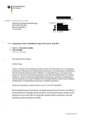 18.06.2021: Antwort zu Kontakten/Absprache BMF und BaFin