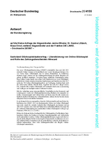 Kleine Anfrage (Liberalisierung Online Glücksspiel/Wirecard)
