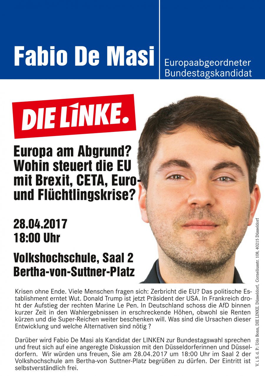 Was sind die Ursachen dieser Entwicklung und welche Alternativen sind nötig? Darüber wird Fabio De Masi als Kandidat der LINKEN zur Bundestagswahl sprechen und freut sich auf eine angeregte Diskussion mit den Düsseldorferinnen und Düsseldorfern. Wir würden uns freuen, Sie am 28.04.2017 um 18:00 Uhr im Saal 2 der Volkshochschule am Bertha-von Suttner-Platz begrüßen zu dürfen. Der Eintritt ist selbstverständlich frei.