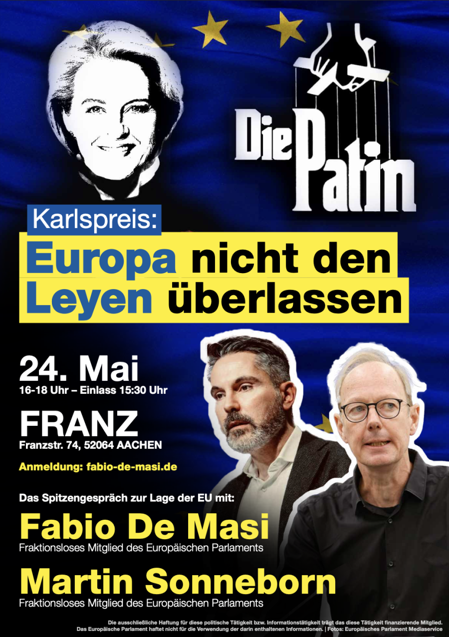 Am Samstag, den 24. Mai 2025, laden Fabio De Masi (fraktionsloses Mitglied des Europäischen Parlaments, BSW) und Martin Sonneborn (fraktionsloses Mitglied des Europäischen Parlaments, Die PARTEI) zur alternativen Laudatio ein.