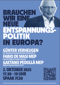 VeranstaltungshinweisAm Donnerstag, 2. Oktober, um 17:30 Uhr lade ich herzlich zu einer Diskussionsveranstaltung mit dem ehemaligen Vizepräsidenten der Europäischen Kommission Günter Verheugen ein. Ort: Europäisches Parlament, Brüssel, Raum SPAAK 7C50. Thema: Brauchen wir eine neue Entspannungspolitik in Europa? Wir sprechen über: